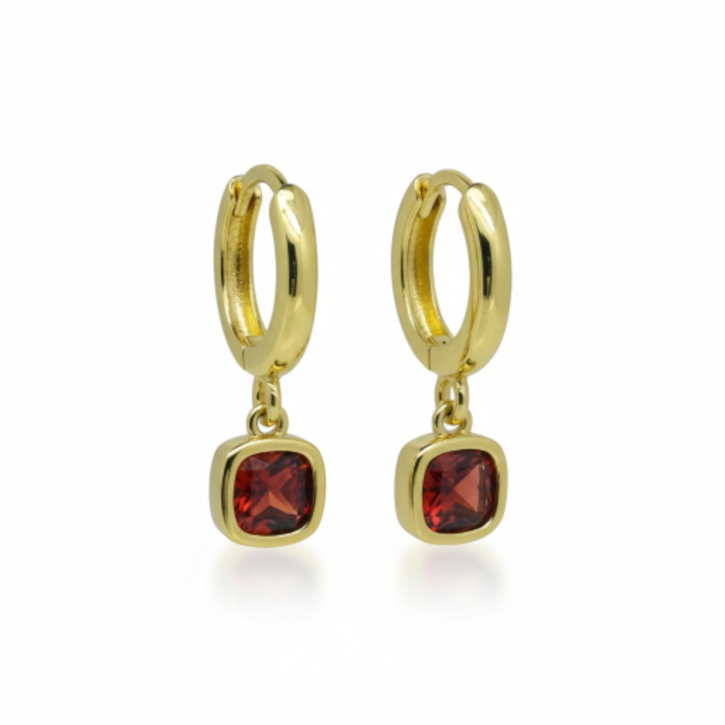 These essential huggies showcase intense, princess-cut crimson CZ stones—a deep, luxurious red that captures attention. The stones are meticulously arranged in crisp, architectural lines, creating a stunning contrast against the warm glow of the comfortable gold-plated setting.